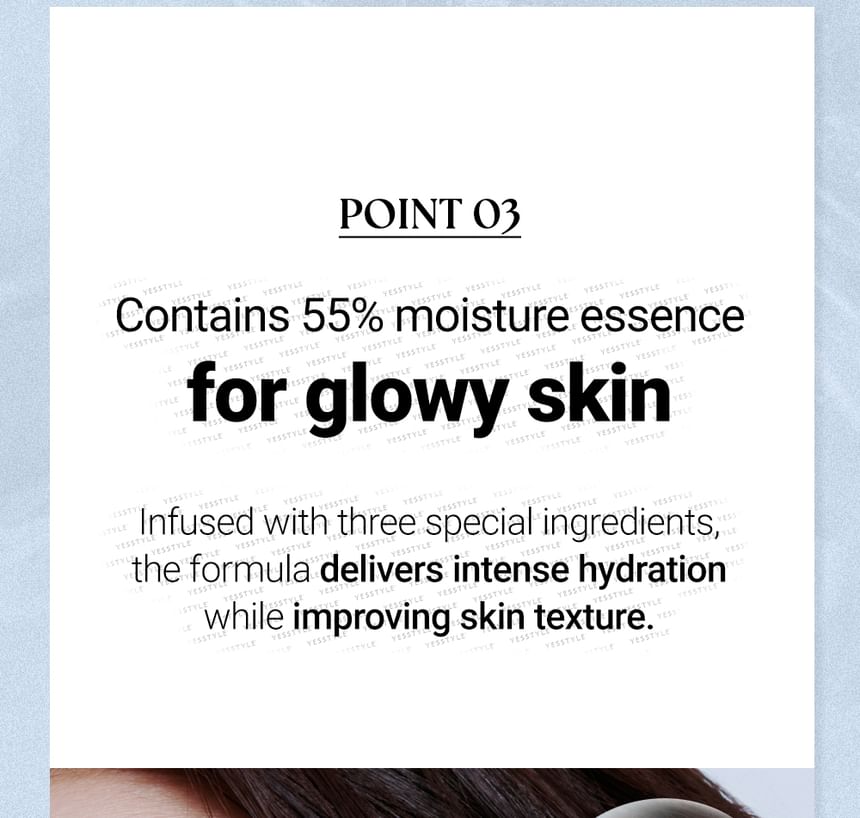 Infused with 55% moisture essence to nourish skin and achieve a radiant complexion.